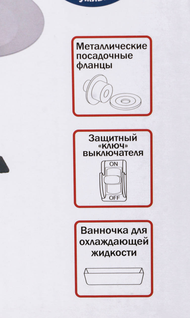 | Особенности: | Металлические посадочные фланцы. Защитный ключ выключателя. Ванночка для воды. |