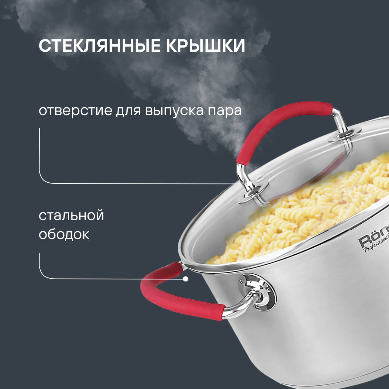 Материал: высококачественная нержавеющая сталь 18/10. Технология: тройное вштампованное, а затем вплавленное дно без воздушных полостей. Материал крышки: термостойкое стекло. Аксессуары: удобные комбинированные: нержавеющая сталь и силикон. Преимущества: эргономичная форма ручек.