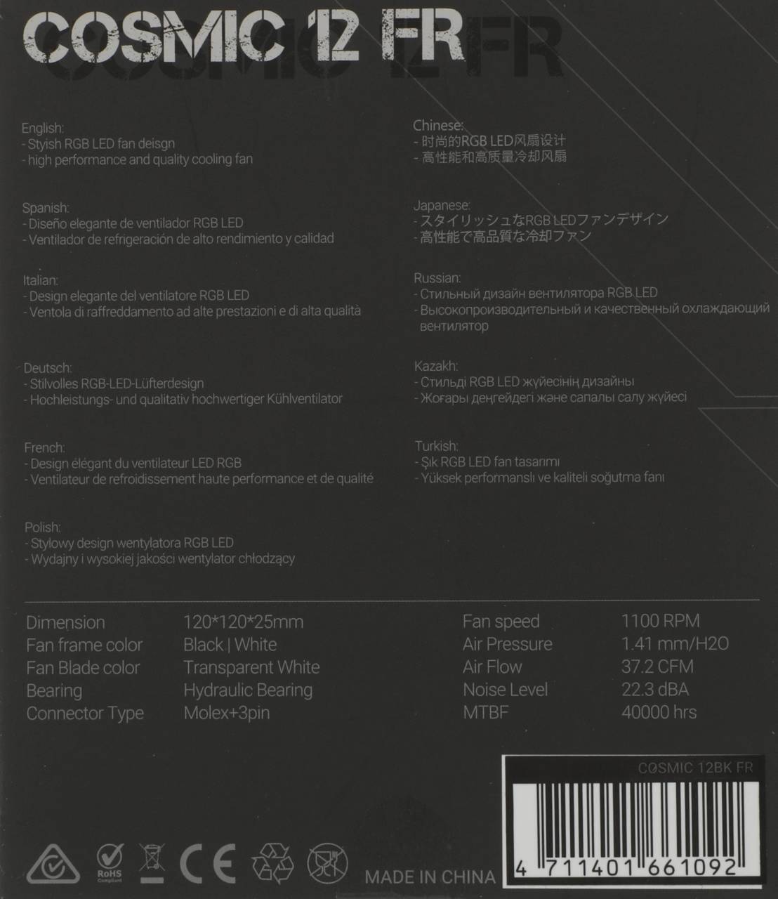 Кулер для корпуса FORMULA Вентилятор для корпуса Cosmic 12BK RGB 120х120x25 черный 3-pin 4-pin Ret