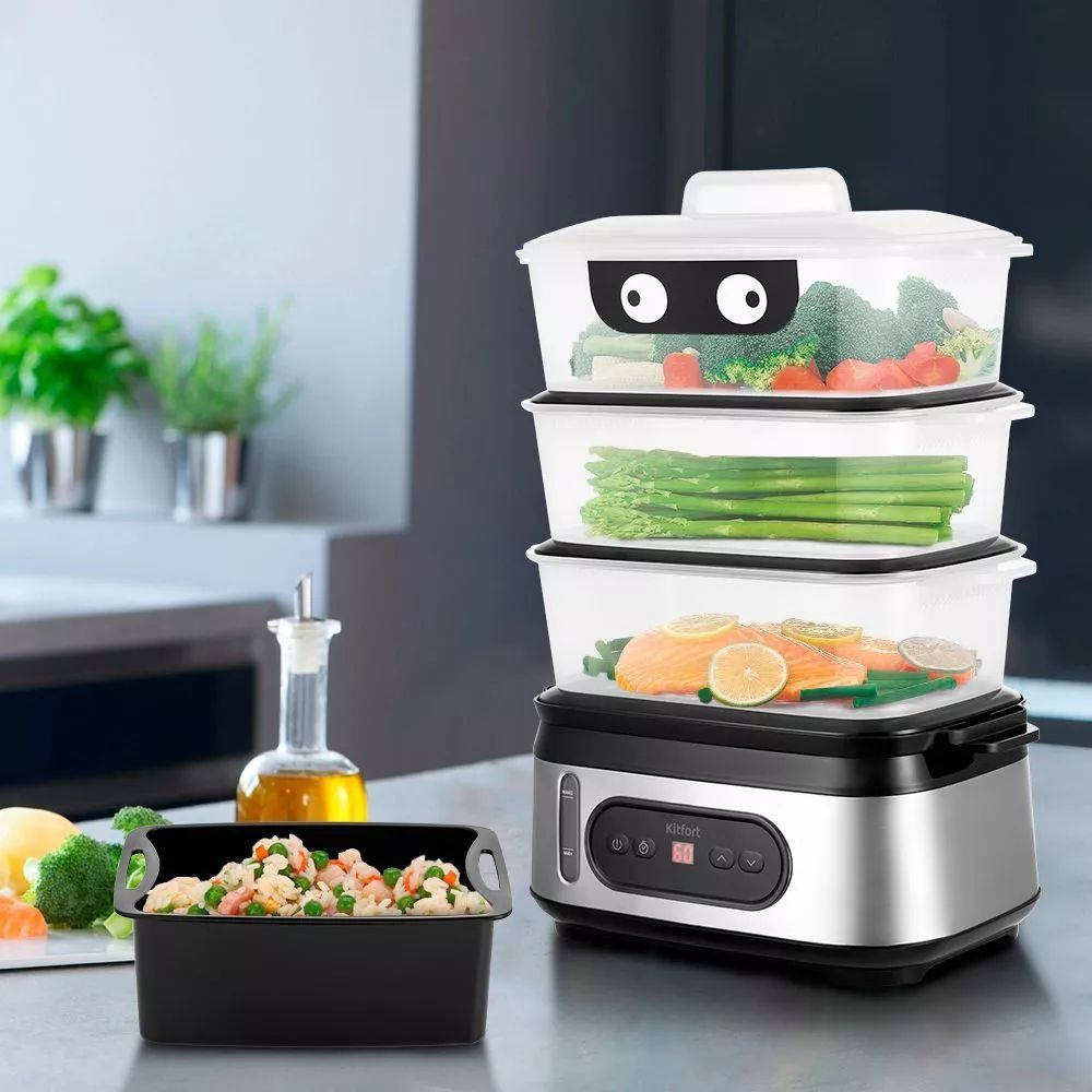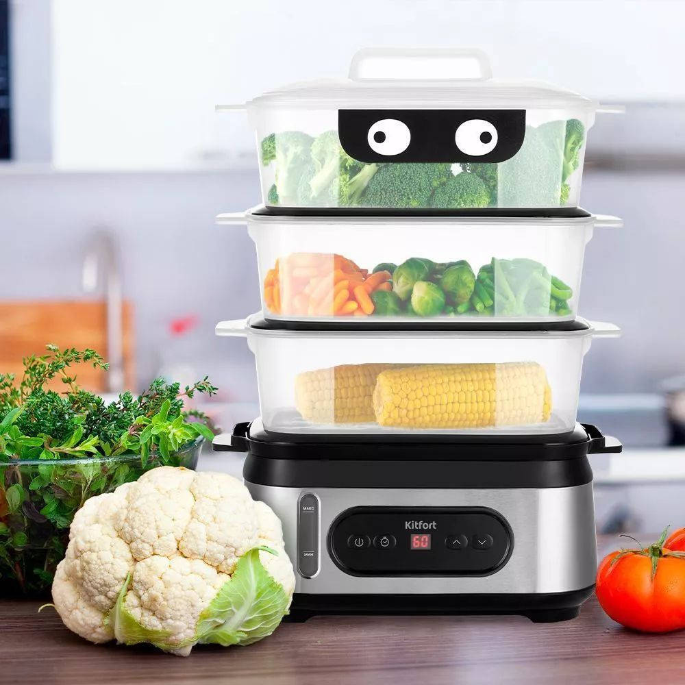 Пароварка КТ-4082 приготовит вам вкусные и питательные блюда, сохранив все полезные витамины и микроэлементы. Достаточно нарезать продукты, уложить их в корзины и выбрать нужное время приготовления. Все остальное пароварка сделает за вас.