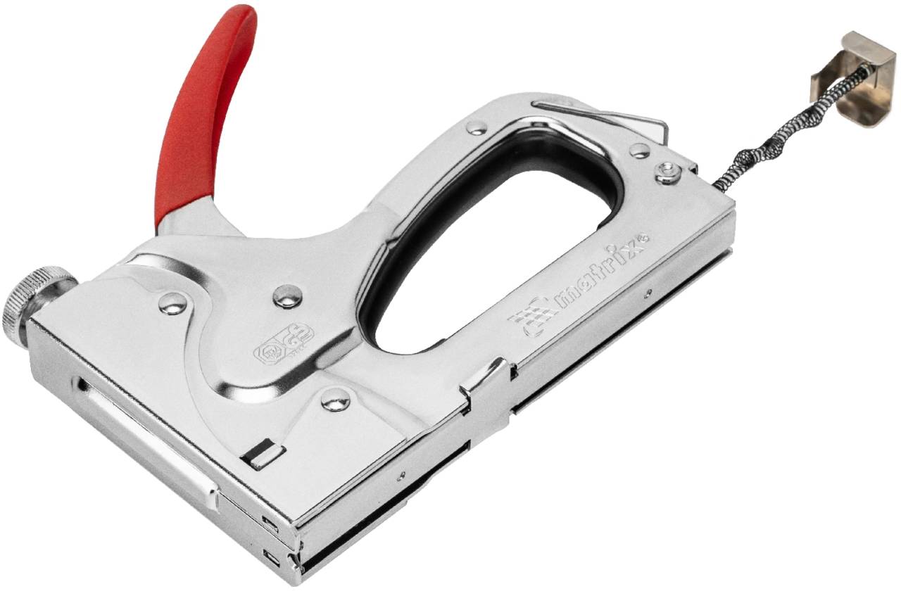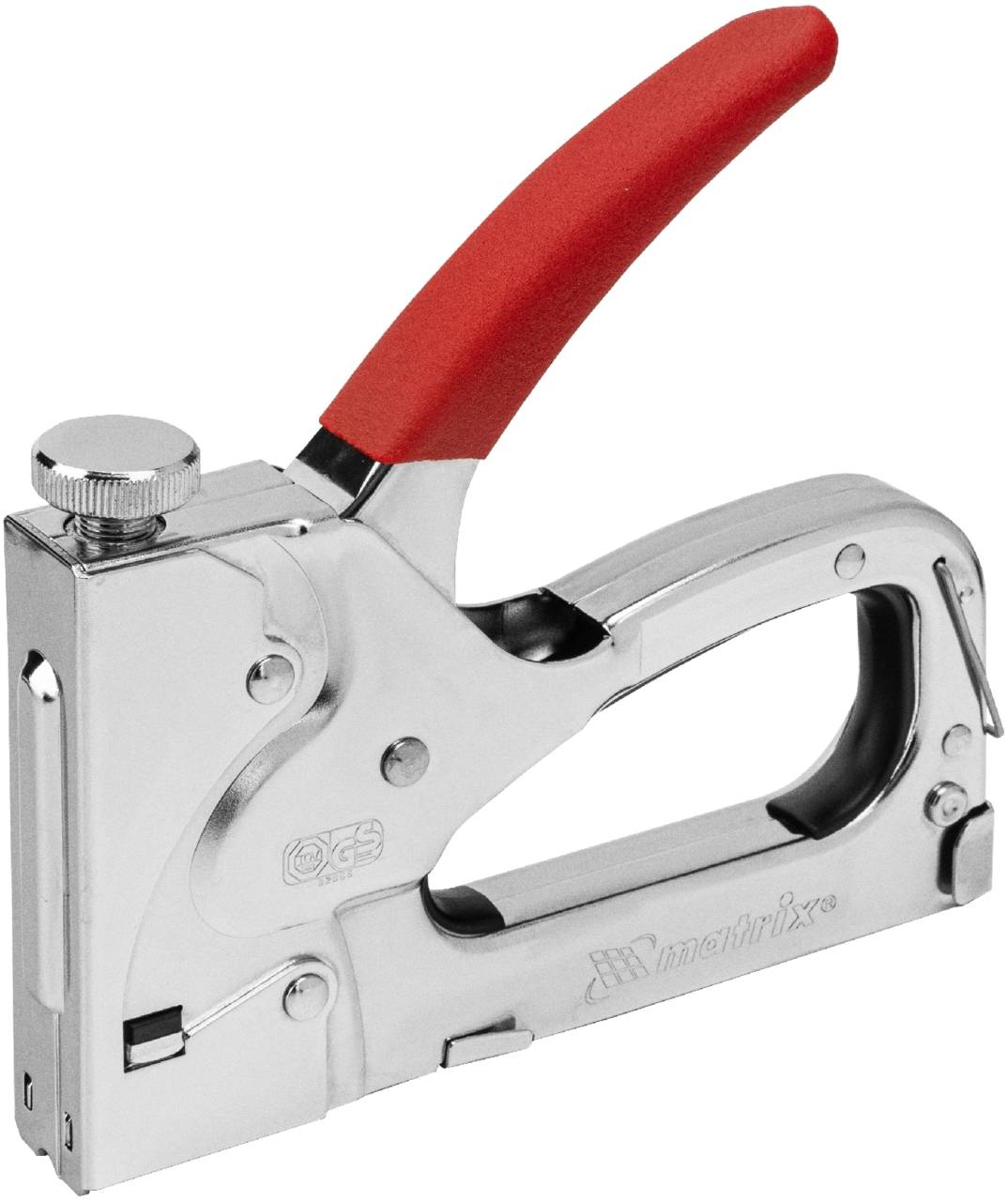 Особенности:Ручки четырехфункционального мебельного степлера MATRIX MASTER 40901 очень удобны для надежного удержания инструмента в руках.Обладают надежной защитой от случайного выстрела скобой за счет металлической петли.
