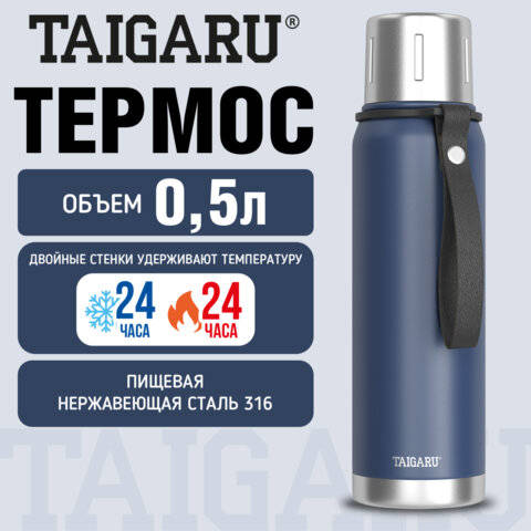 Термос TAIGARU 0,5л CHOICE, нержавеющая сталь SUS316, крышка/кружка, ремешок, синий матовый, , 700312